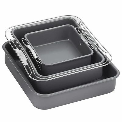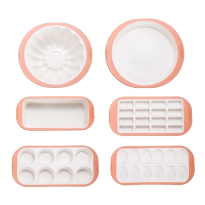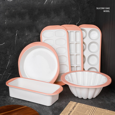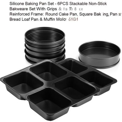 Nasz profesjonalny silikonowy zestaw do pieczenia obejmuje okrągłą patelnię do ciast, kwadratową patelnię do pieczenia, patelnię do chleba,i kształtów do ciastek - wszystkie z uchwytami i ramkami wzmocnionymi metalowo dla trwałości i łatwej obsługi.
